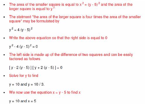 For the second solution y = 10 / 3, x is negative and cannot be accepted as the length of the side of a square must be positive.