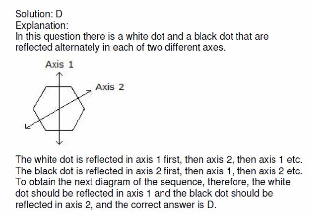 Solution: C Explanation: In this question there is a triangle, a pentagon and a hexagon that rotate around the eight triangles that make up a regular octagon, each according to its own rule. The triangle always rotates by 3 places clockwise. When this rule is applied, the correct answer for the missing diagram of the sequence could be A, C or D. The pentagon always rotates five places clockwise. When this rule is also applied, the correct answer for the missing diagram of the sequence could be A or C. The hexagon always rotates six places anticlockwise. When this rule is also applied, the correct answer for the missing diagram of the sequence must be C.