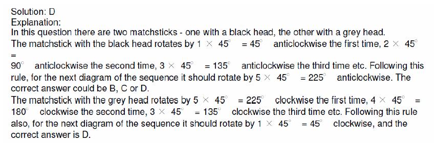 Solution: D Explanation: In this question there are five coloured circles that rotate each time by 90 degree clockwise. When this rule is applied, the correct answer could be A, B or D. At the same time the colours change from one diagram to the next - black changes to white, white changes to grey and grey changes to black. When this rule is also applied, the correct answer must be D.