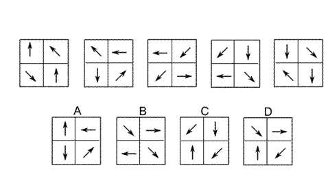 Solution: D Explanation: In this question the two arrows in the top row rotate by 45 degree anticlockwise each time and the two arrows in the bottom row rotate by 45 degree clockwise each time. Following these rules, the correct answer is D.