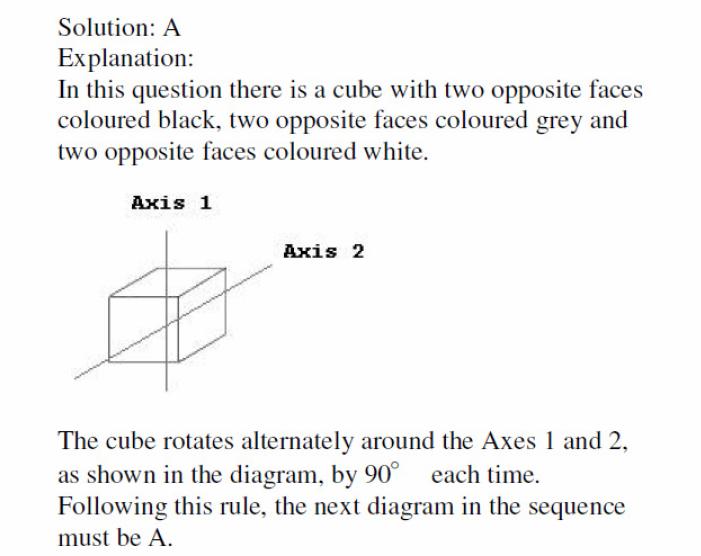 Solution: B Explanation: In this question there are two rules to follow that are applied alternately. The first rule is that the group of matches is reflected in the diagonal stretching from the bottom left corner to the top right corner. The second rule is that the group of matches is rotated about the centre by 90° anticlockwise. To find the missing diagram of the sequence, the first rule should be applied, giving answer B. When the second rule is applied to answer B, the sequence is continued correctly with the final diagram.