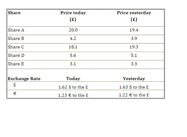 28. A dealer buys 250 Share Ds and 350 Share Es at yesterday’s prices and sells these at today’s prices. How much profit or loss does the dealer make?